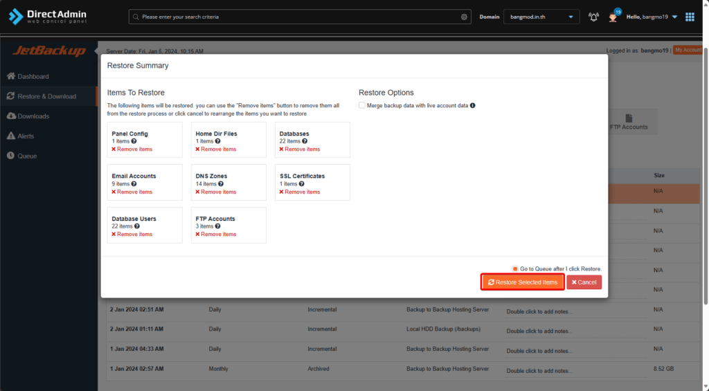 5. กด Restore Selected Items ระบบจะทำการ Restore รายการที่ลูกค้าเลือกไว้ครับ